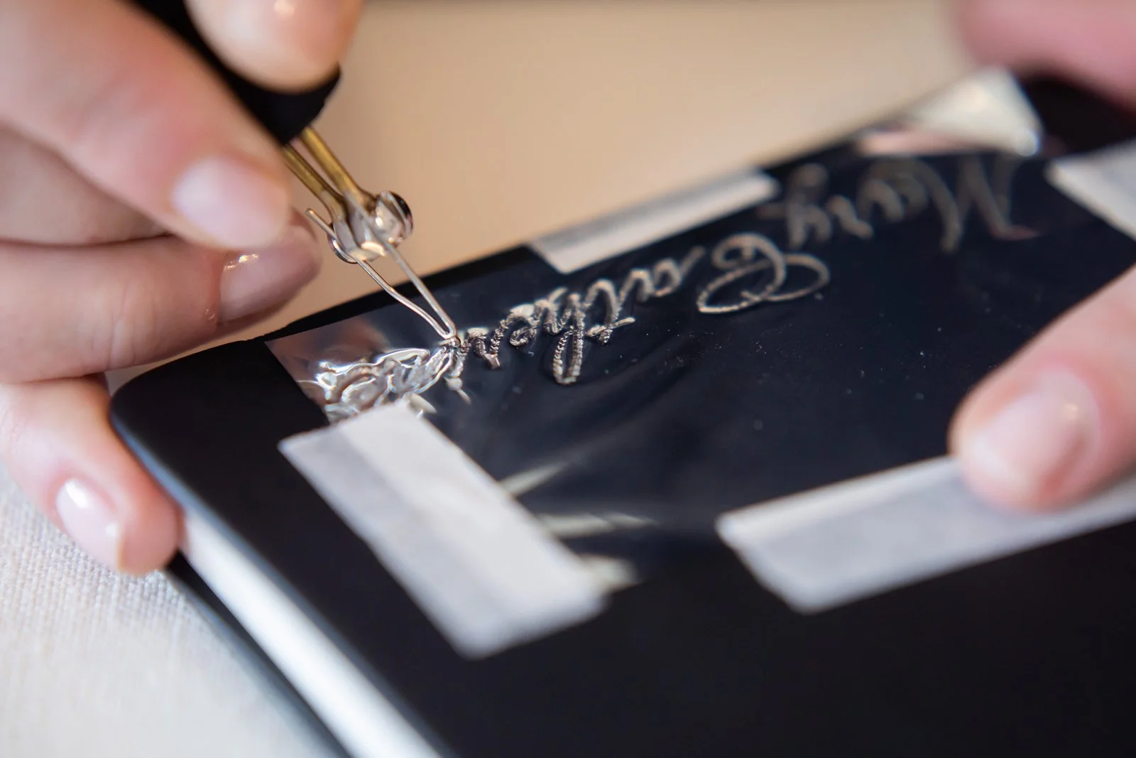 Using a heated pen, Grace adds foil-embossed lettering to leather, faux leather, ribbon and other select textiles. She welcomes the opportunity to add personalization to your brand’s item or to create a personalized favor for party guests or patrons at events and fundraisers.